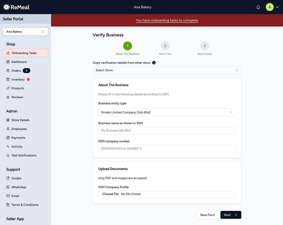 When your account has been created, you will be logged into the Seller Portal. You can also use the same login and password to access the ReMeal Seller App.